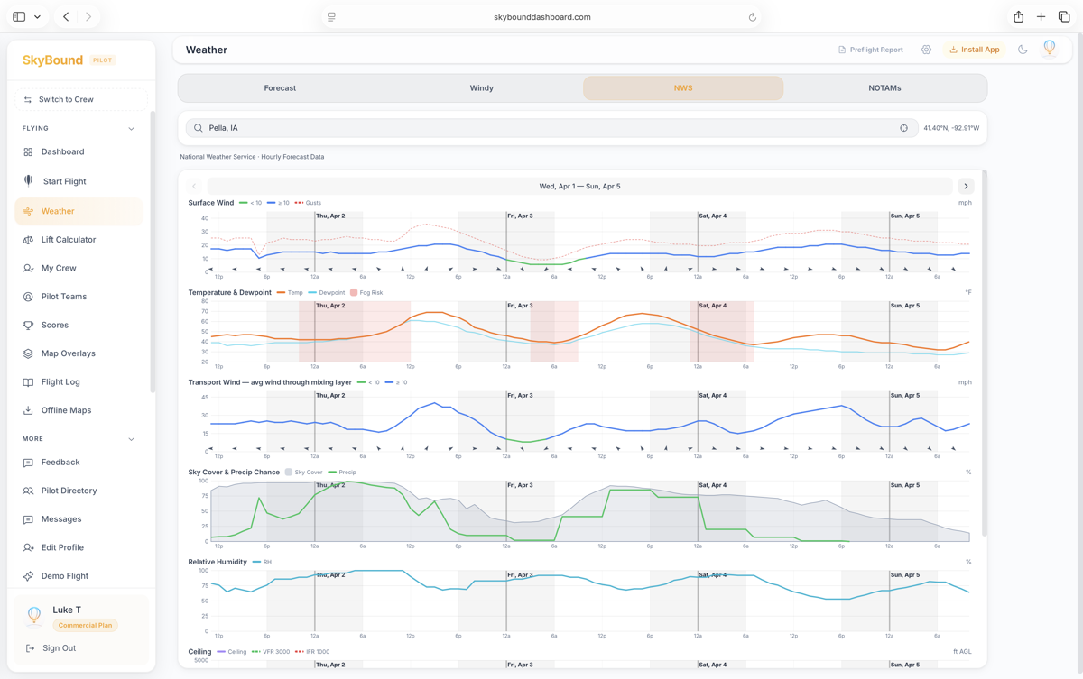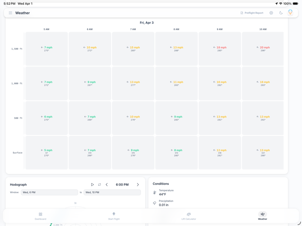 Flight-specific weather forecasts with wind speed at multiple altitudes, surface conditions, and pibal-style wind profiles. Know exactly when conditions are flyable.