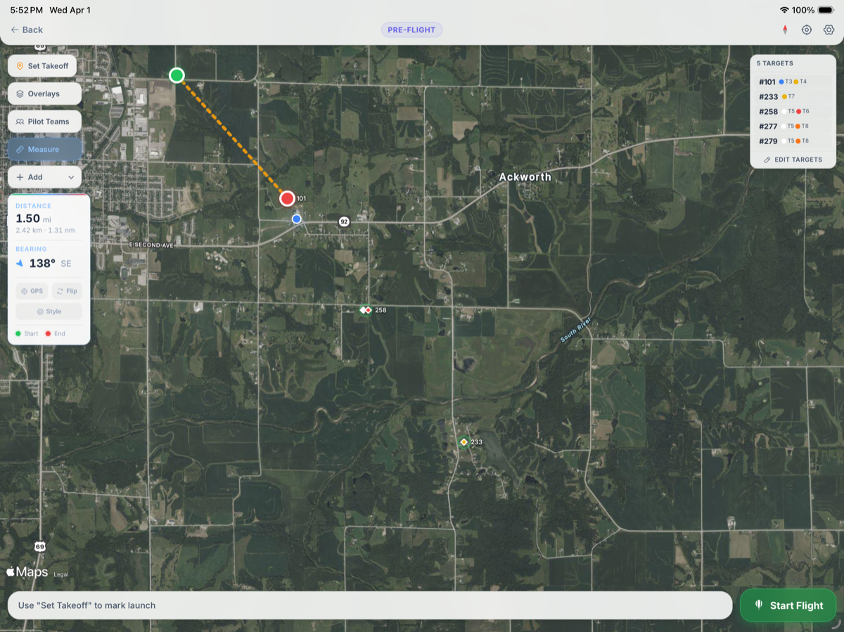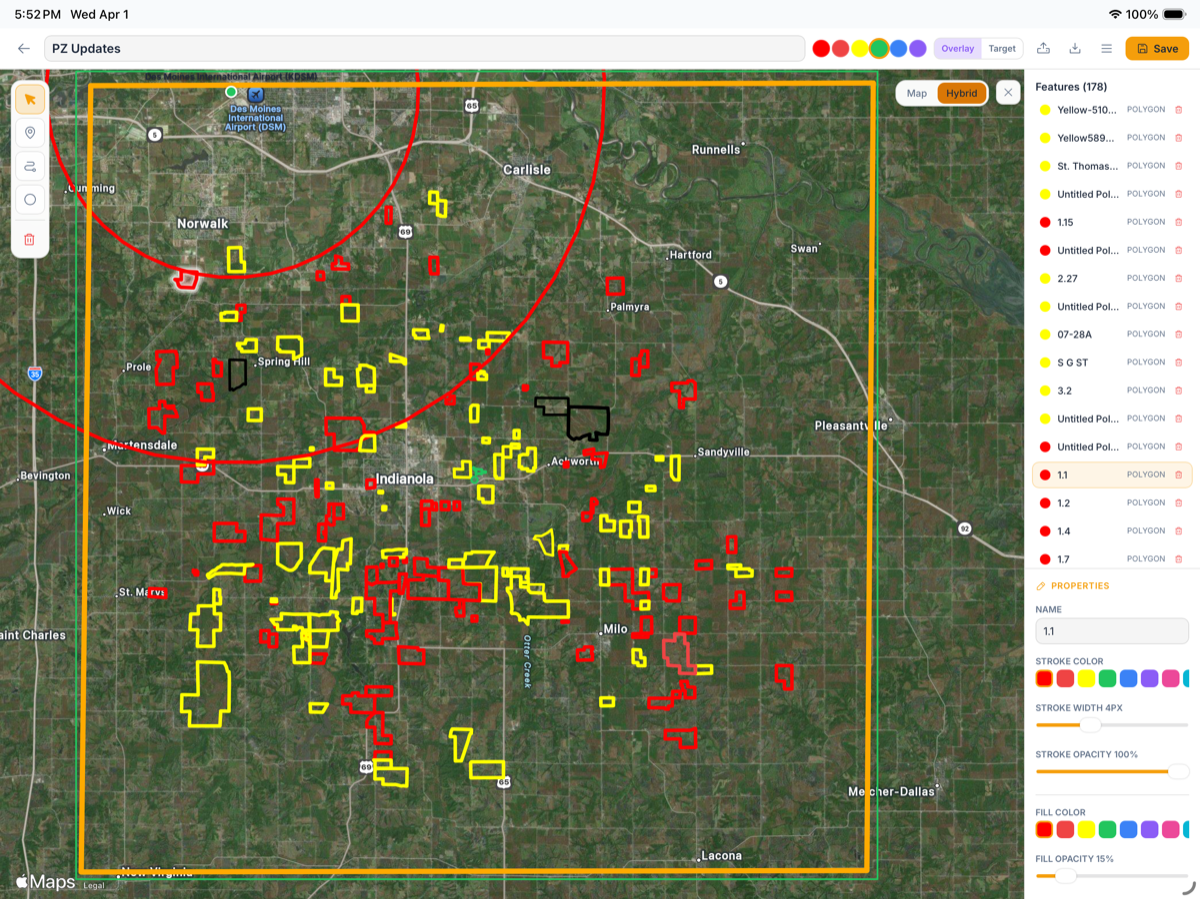 Build overlays from scratch or import KML, GeoJSON, and GPX files. Draw polygons, lines, circles, and points directly on the map. Export to any format. Everything syncs across all your devices — create on your computer, fly with it on your iPad.