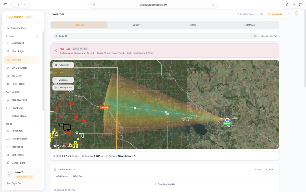 Flight-specific weather forecasts with wind speed at multiple altitudes, surface conditions, and pibal-style wind profiles. Know exactly when conditions are flyable.