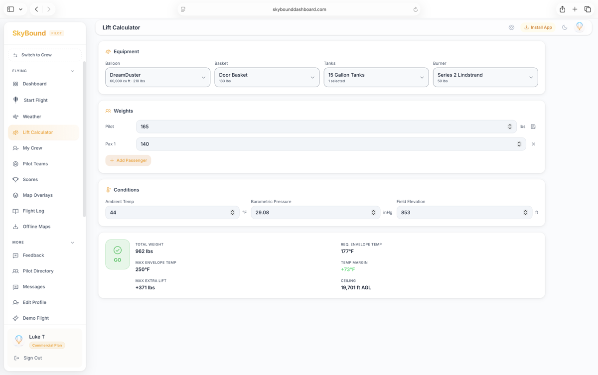 Calculate your balloon's lifting capacity based on envelope volume, temperature, altitude, and payload weight. Know your performance margins before you launch.